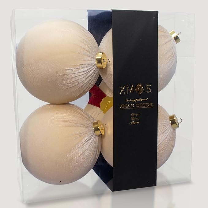 4PCS White Velvet Christmas Ornaments Set – 6 Inch Large Flocked Shatterproof Baubles for Xmas Tree Decoration, Hanging Ornaments for Holiday & Home Décor (Ivory White, 6 Inch / 15 cm)
