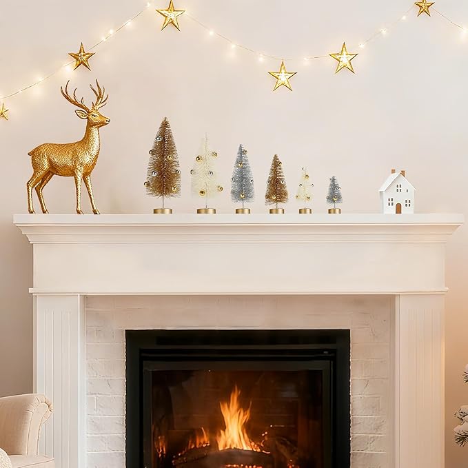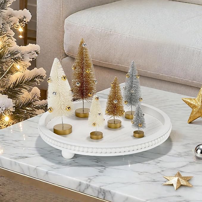 - 🎄 6-PACK GLITTER TREE SET: Includes 6 assorted-size mini bottle brush trees in elegant gold, silver, and white tones — each dusted with sparkling glitter and decorated with shiny silver and gold beads.
