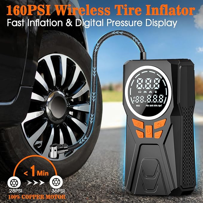 - Cordless Air Compressor: It isn't just a jump starter, it's also a professional tire inflator with real-time digital pressure gauge and automatic shut-off function. The air compressor offers 4 selectable units (PSI, BAR, KPA, KG/cm²), which can rapidly inflate a standard car tire from flat to 20 PSI in approximately 1 minutes and provides 25 minutes continuous inflation with 160PSI maximum pressure. The package includes 4 versatile nozzles, compatible for cars, truck, motorcycles, bicycles, sports balls, and other inflatables.