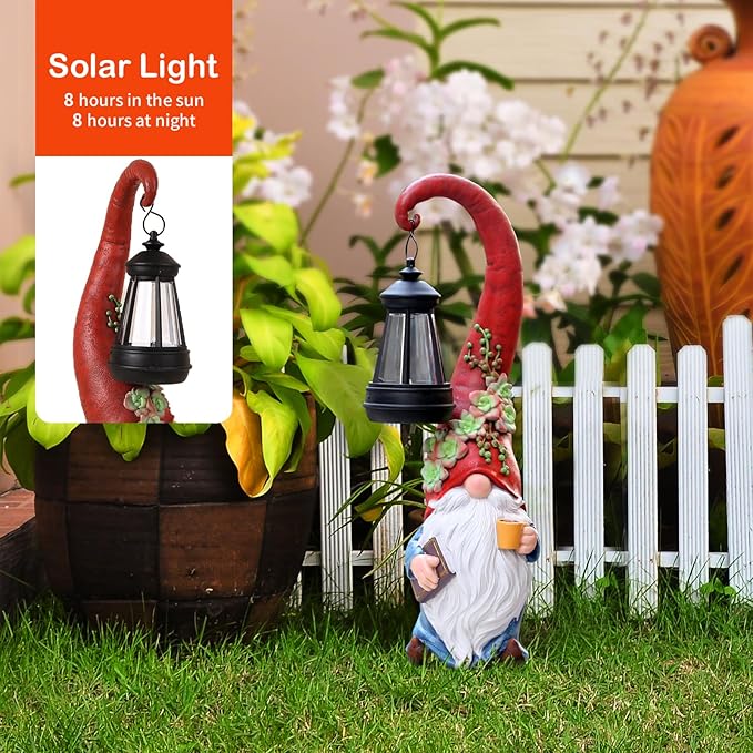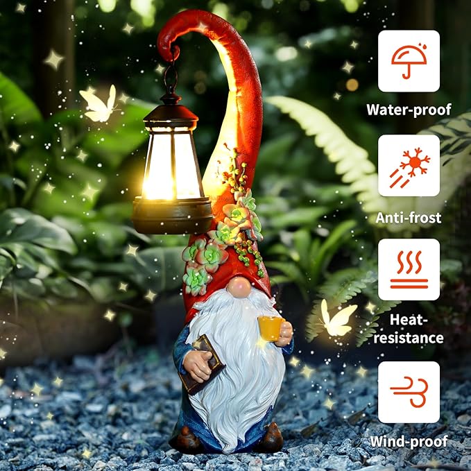 - BEAUTIFUL HOME AND GARDEN DECORATION: The garden gnomes decorations for yard Decor of this solar light is for gardens, terraces, balconies, pathways and more. It creates a cozy and welcoming atmosphere, perfect for outdoor gatherings, relaxing, or just adding a decorative touch to your surroundings