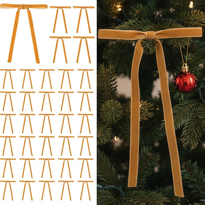 36 Pcs Velvet Christmas Tree Bows Decor, Vintage Wreath Bow for Christmas Garland, Gift Wrapping, Xmas Tree, 3/8'' Wide, 5 * 7 inch (Khaki)