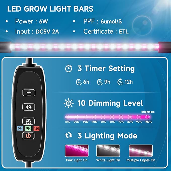 - Built-in Dual LED Grow Lights: Two IP67-rated waterproof LED growth lights deliver direct light with minimal loss. With the light controller, you can set 3 lighting modes, and freely choose adjustable brightness and timer set. Features 24 pink LEDs + 24 warm white LEDs (3000K), 6W power, and PPF up to 6µmol/s. Simulates natural light spectrum for healthy seedling development.