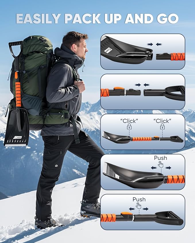 - 【Versatile for Multiple Uses】Beyond snow removal, this tool doubles as a camping shovel, trowel, or small shovel for outdoor activities. It’s a handy addition to your car tools collection, suitable for shovels for digging light snow or as a compact folding shovel alternative for on-the-go needs.
