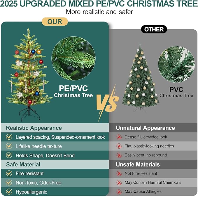- ๐๐๐ง๐ข๐ช๐ฎ๐ ๐๐ซ๐๐ฆ๐ข๐ฎ๐ฆ ๐๐ก๐ซ๐ข๐ฌ๐ญ๐ฆ๐๐ฌ ๐๐ซ๐๐: Compared to most Christmas trees on the market, this 4ft douglas fir Christmas tree stands out with its high-quality PE/PVC hybrid materials. Boasting 298 strong branch tips, it delivers a realistic and fuller look, rivaling natural pre-lit Christmas trees. This tree is durable, non-allergenic, odorless, and fade-resistant, with branches capable of securely holding a variety of holiday decorations.