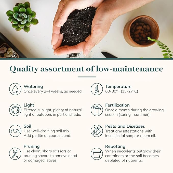 - Availability and Seasonality: Our packs feature a wide assortment of rosette and echeveria-style succulents chosen for beauty and resilience. Availability may vary from photos based on the season, ensuring you always receive fresh, premium-quality plants.